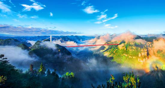 矮寨大橋飛越在德夯峽谷之巔,是世界跨峽谷跨徑最大的鋼桁梁懸索橋,大橋跨徑1176米,橋面距離峽谷底部355米。2007年10月開始修建,2012年3月建成通車,總造價15億元。大橋以克服了五大“世界級”施工難題和創(chuàng)造了四項“世界第一” 的高科技含量享譽中外,被贊為橋梁建筑藝術(shù)和自然景觀完美結(jié)合的典范。矮寨大橋不只是連接湘渝的重要交通設施,更是湘西的標志性景點。