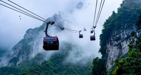 天門山山頂森林觀光纜車,纜車以天門山主峰云夢(mèng)仙頂為起點(diǎn),以天門山寺前櫻桃灣廣場(chǎng)為終點(diǎn),總長(zhǎng)度為800米,單程運(yùn)行約10分鐘,為無(wú)遮蓋的雙人吊椅式,每小時(shí)運(yùn)力可達(dá)600人。