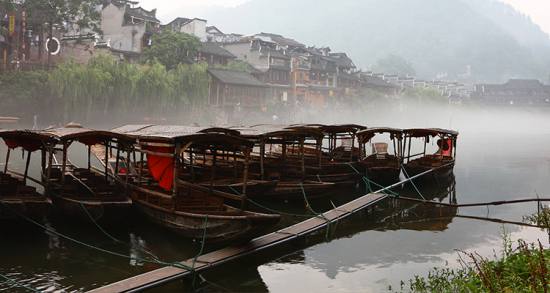 沱江河是古城鳳凰的母親河,她依著城墻緩緩流淌,世世代代哺育著古城兒女。坐上烏蓬船,聽著艄公的號子,看著兩岸已有百年歷史的土家吊腳樓,別有一番韻味。順水而下,穿過虹橋一幅江南水鄉(xiāng)的畫卷便展現(xiàn)于眼前:萬壽宮、萬名塔、奪翠樓……一種遠離塵世的感覺悠然而生。沱江的南岸是古城墻,用紫紅沙石砌成,典雅不失雄偉。城墻有東、北兩座城樓,久經滄桑,依然壯觀?! °铀宄?,城墻邊的河道很淺,水流悠游緩和,可以看到柔波里招搖的水草,可以撐一支長篙漫溯。沿沱江邊而建的吊腳樓群在東門虹橋和北門跳巖附近,細腳伶仃的立在沱江里,象一幅永不回來的風景。